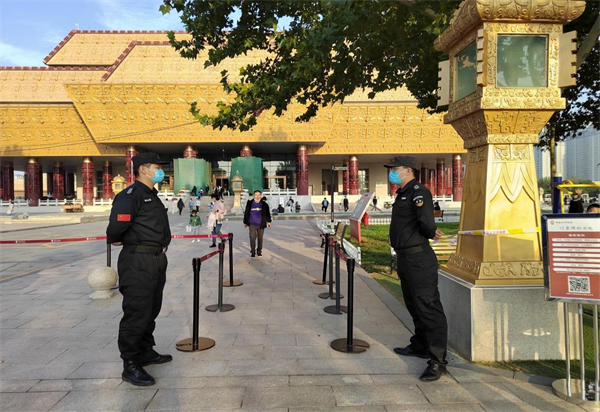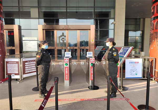 根據(jù)工作職責(zé),外圍隊(duì)員負(fù)責(zé)查驗(yàn)游客佩戴口罩、場所碼、48小時核酸檢測陰性報(bào)告、電子門票預(yù)約等。女子班隊(duì)員負(fù)責(zé)安檢,提醒游客有序掃碼掃票,并進(jìn)行危險物品檢查。各展廳隊(duì)員在崗在位,維護(hù)參觀秩序。大家不畏辛苦,堅(jiān)守崗位履職盡責(zé),國慶期間共接待游客約2萬人次,平均每日3000人次,圓滿完成各項(xiàng)安保任務(wù)。