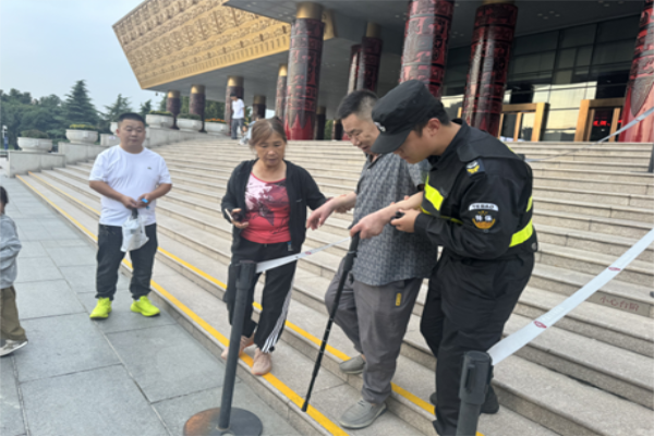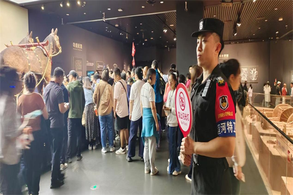 節(jié)日期間,特保大隊實行24小時輪班值守,全體隊員全情投入安保工作。一是嚴把入口關(guān)。安檢隊員嚴守各場館入口安檢關(guān)口,細致排查易燃易爆、管制刀具等違禁物品。僅殷墟博物館、中國文字博物館、漢字公園3處,日均完成超4萬余人次安檢,精準攔截多起違禁品,筑牢“危險物品不入園”的堅實防線。二是強化內(nèi)部巡邏。館內(nèi)隊員加密巡邏頻次,既重點盯防文物展柜等安全要害,又聚焦客流易聚集區(qū)域。實時疏導(dǎo)擁擠人群,有效防范各類安全風(fēng)險。三是維護現(xiàn)場秩序。游客熱點區(qū)域,隊員遇人員飽和時,及時引導(dǎo)游客分批次有序游覽,保障良好秩序。四是提供暖心幫助。特保隊員專注引導(dǎo)行人安全通行。遇到老年游客或攜帶重物的游客,主動上前攙扶、協(xié)助搬運行李,以貼心舉措傳遞安保溫度。